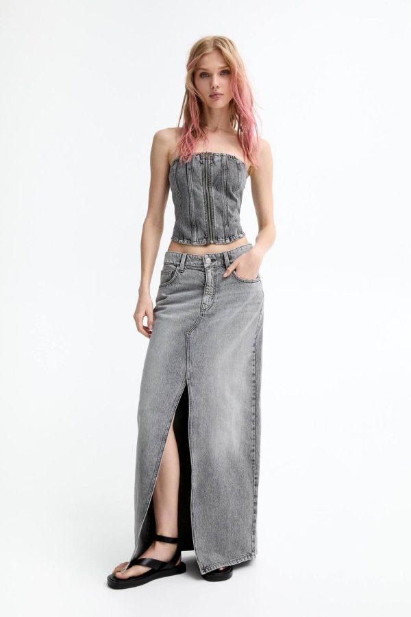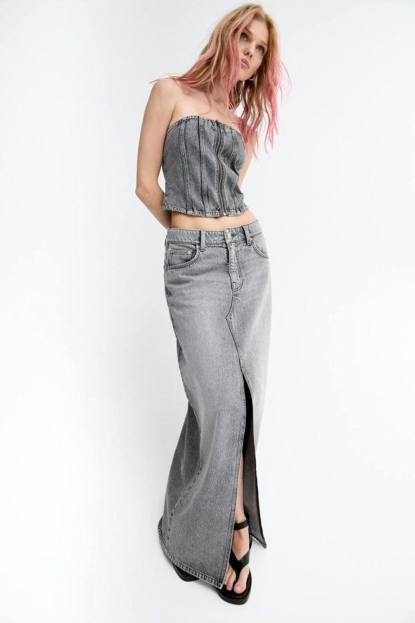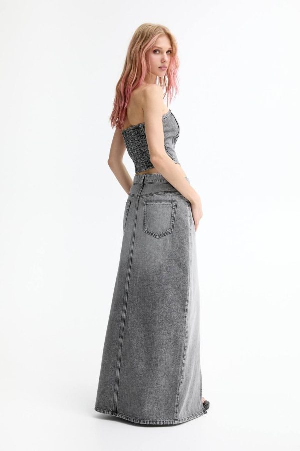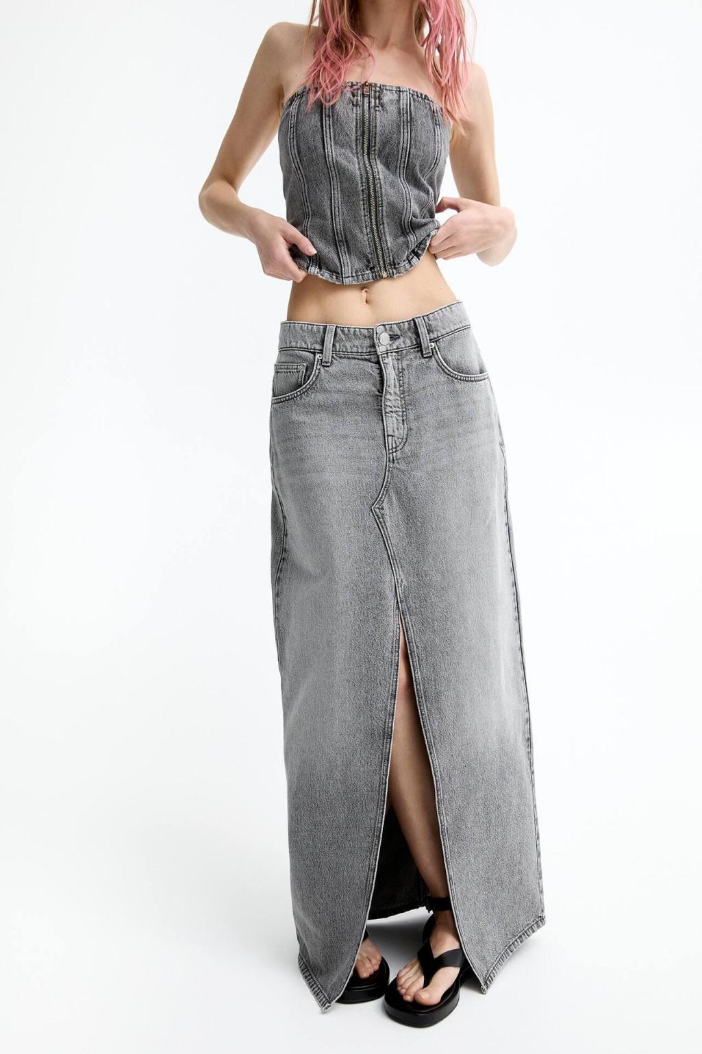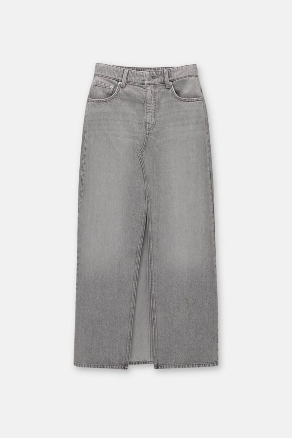 Mid-Rise Extra-Long Denim Skirt Featuring A Front Slit, Belt Loops, Five Pockets And Zipper Fly And Button Fastening. Made Of Cotton Fabric.