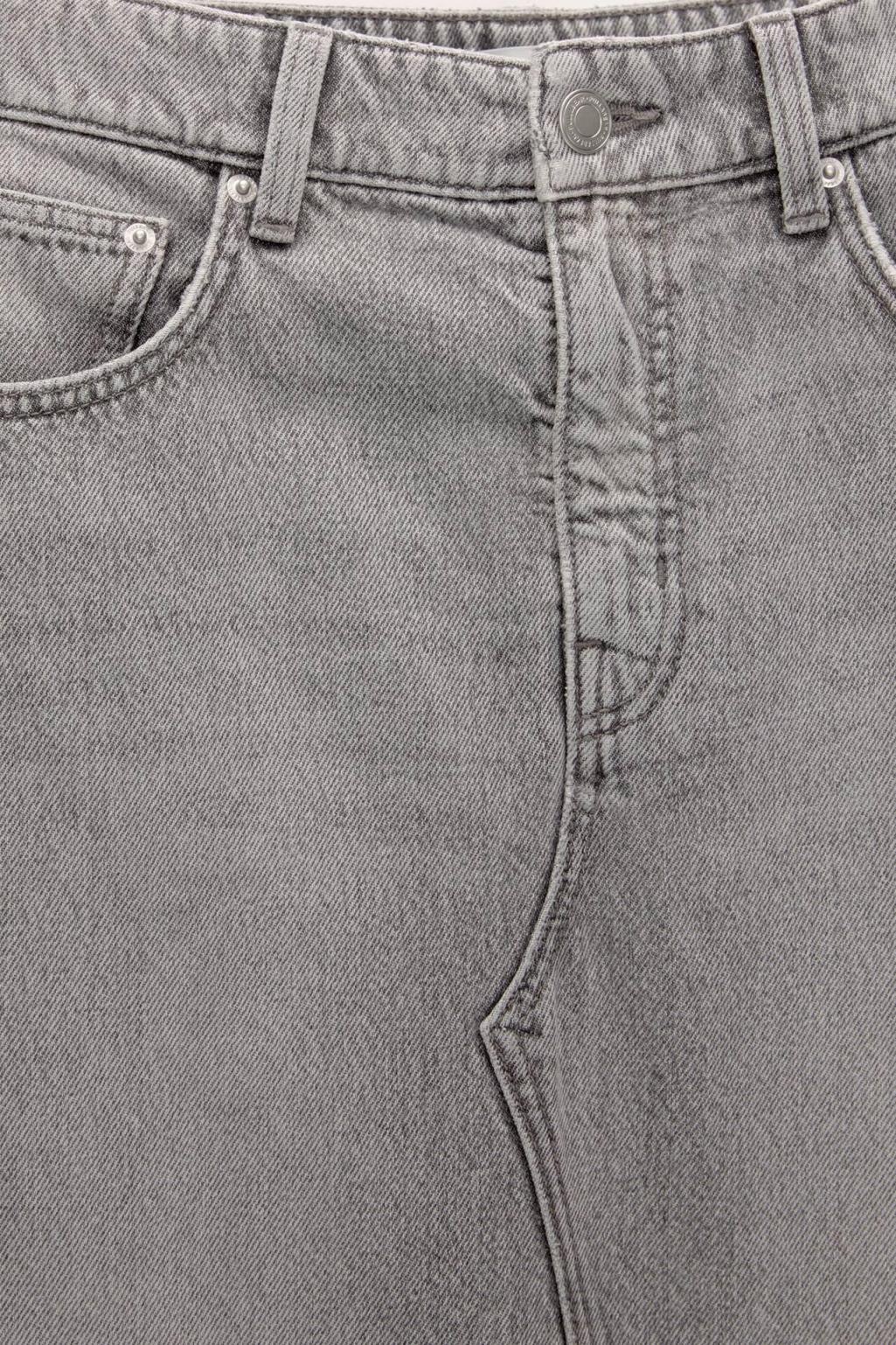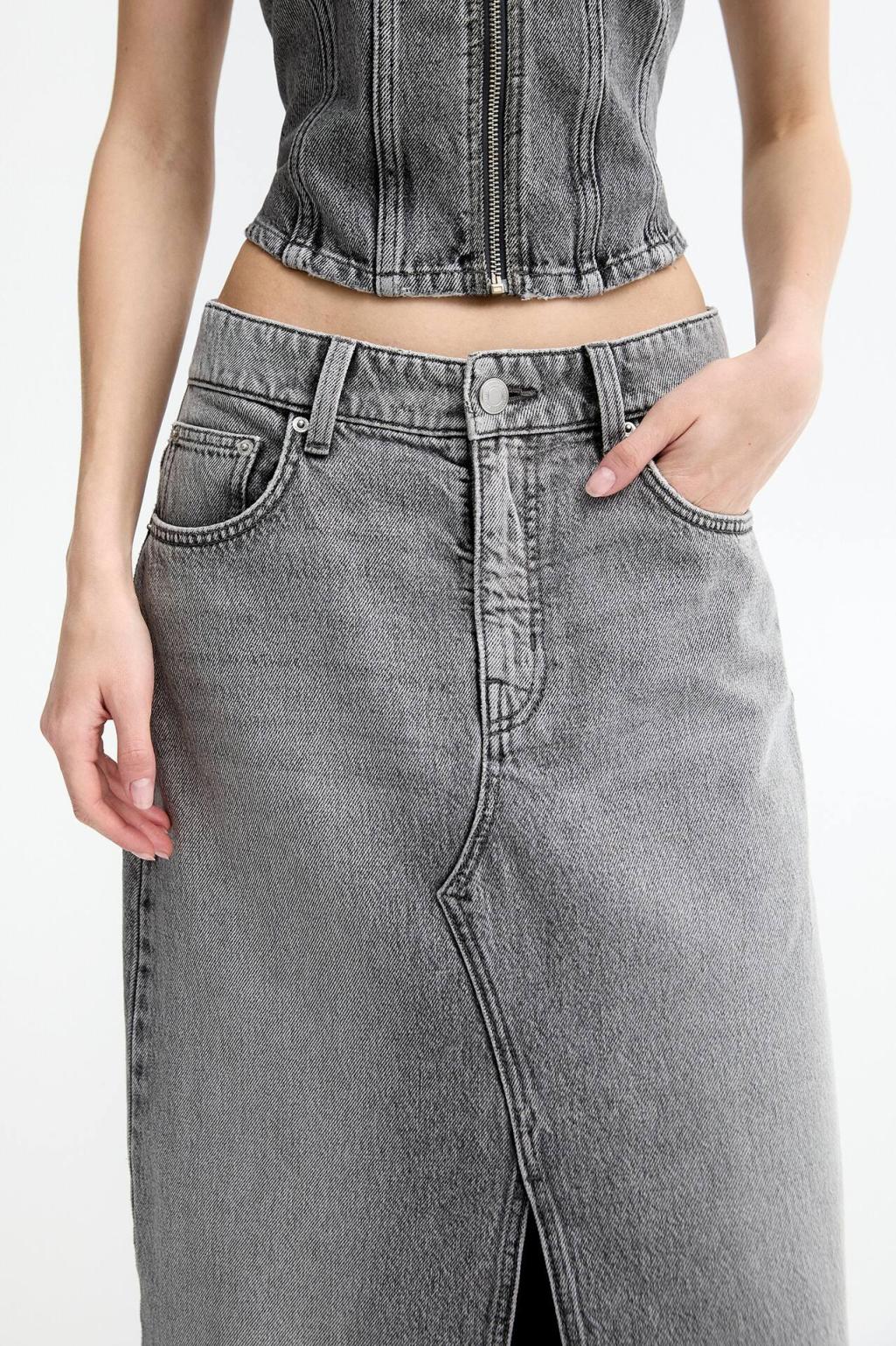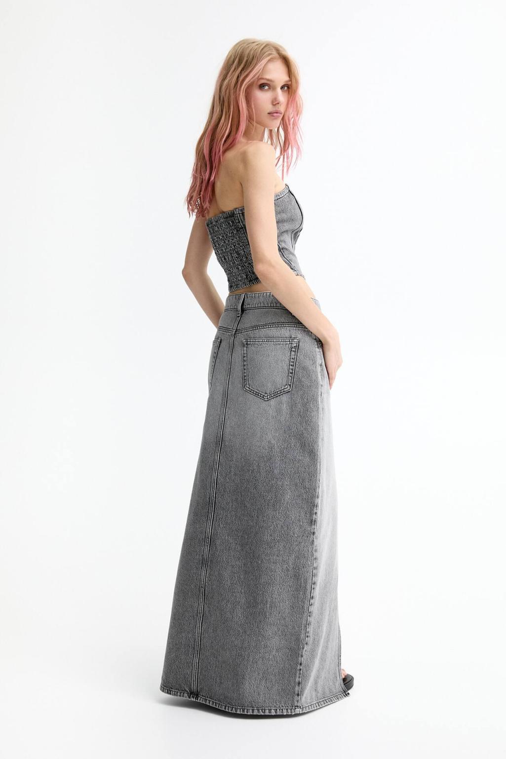 Mid-Rise Extra-Long Denim Skirt Featuring A Front Slit, Belt Loops, Five Pockets And Zipper Fly And Button Fastening. Made Of Cotton Fabric.