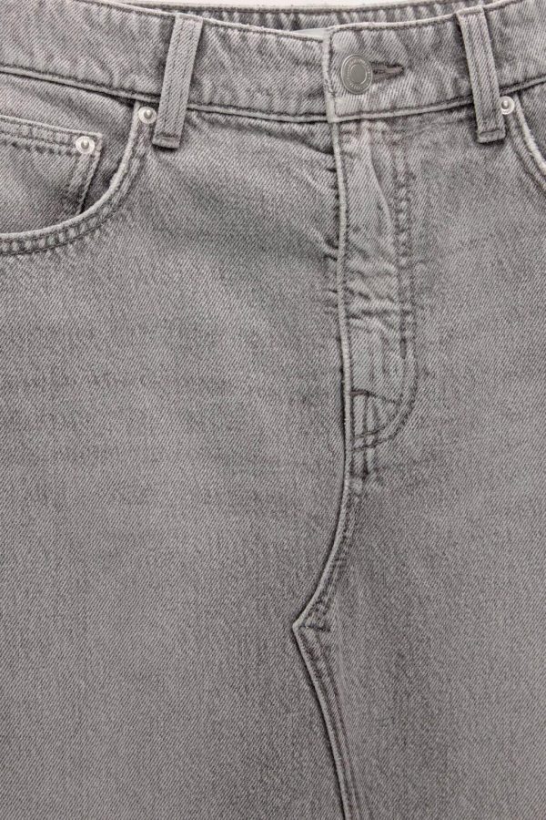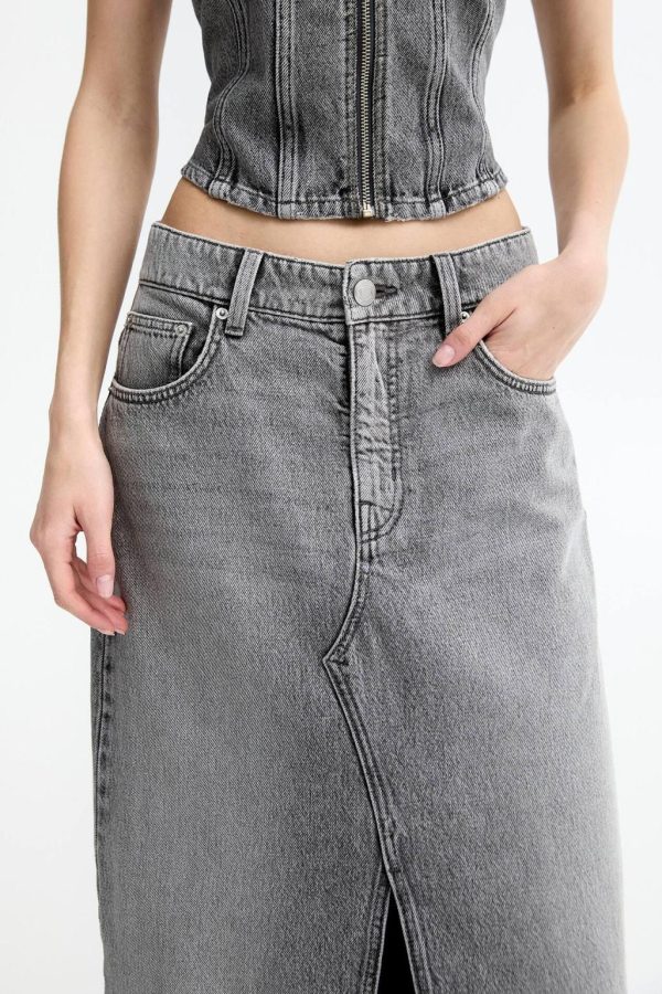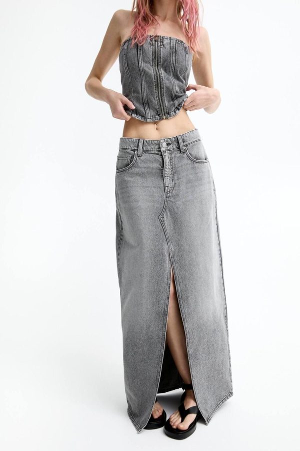 Waist: Mid Rise Fabric: Not Stretchy Mid-Rise Extra-Long Denim Skirt Featuring A Front Slit, Belt Loops, Five Pockets And Zipper Fly And Button Fasten…